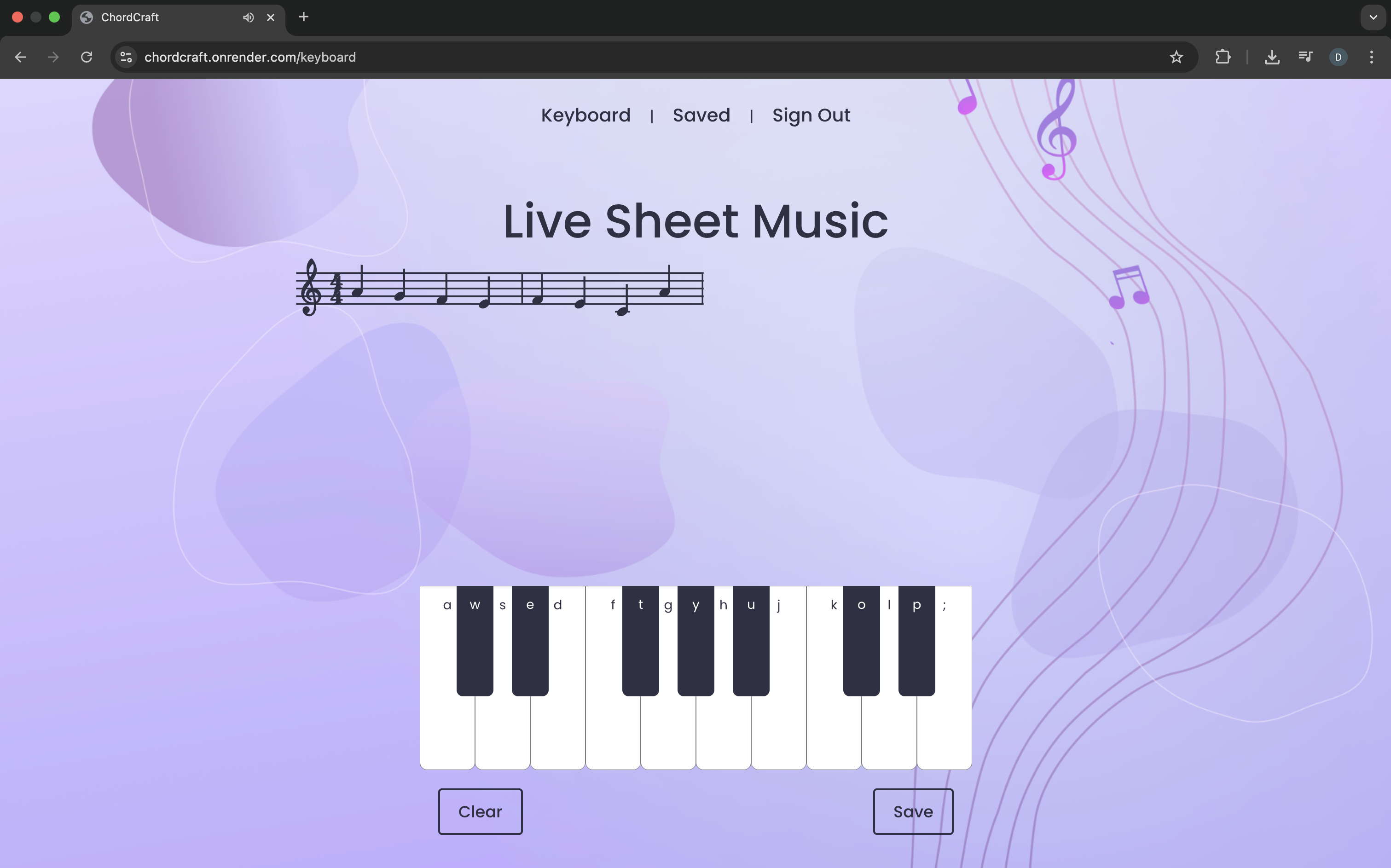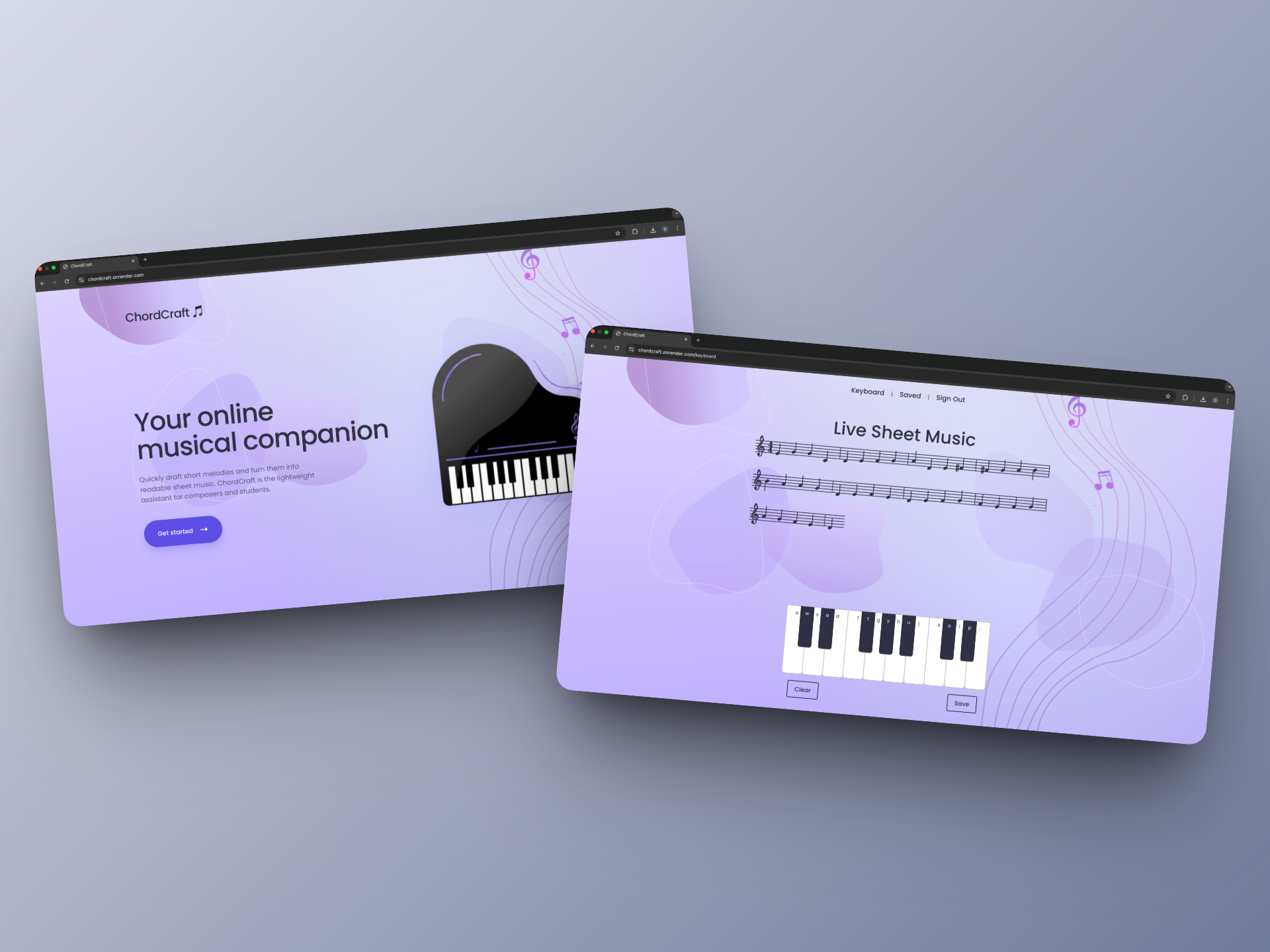 We built ChordCraft to allow users to capture their musical ideas before they disappear. The app features a virtual keyboard that responds to keypresses with sound, and instantly converts your playing into ABC notation that renders as sheet music. Everything you create is saved to MongoDB and tied to your account with user authentication.