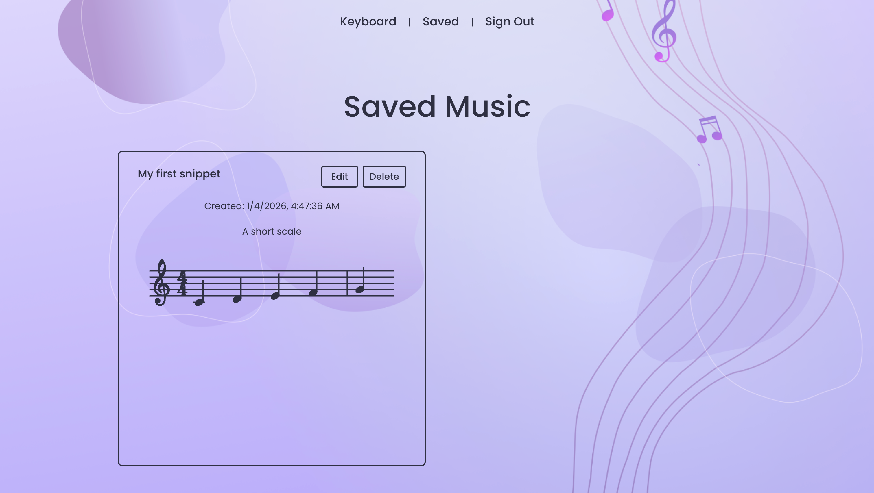 ABCJS is used to render dynamic sheet music as you play, with measures, clefs, and key signatures. The system also includes full CRUD operations for saving and organizing compositions, protected by user authentication.