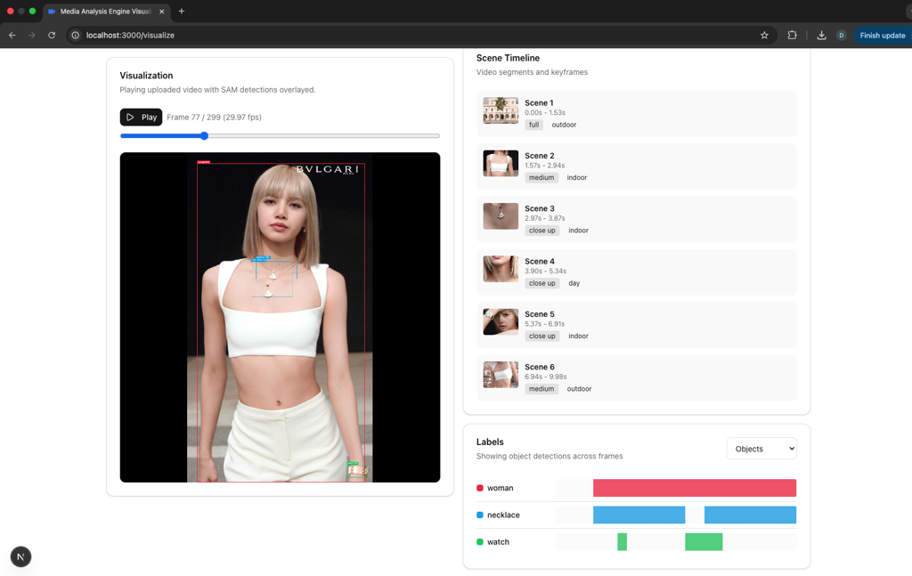 The next challenge was to detect objects in the media. When I was first coming up with solutions, it seemed that each had its own strengths and weaknesses. We wanted to use custom text prompts for detecting objects, so this meant that we needed to either train a custom model, which would require a large amount of training data and manual annotation for each custom label set, or use a zero-shot object detection model, which would be very slow if done frame by frame on a video.
