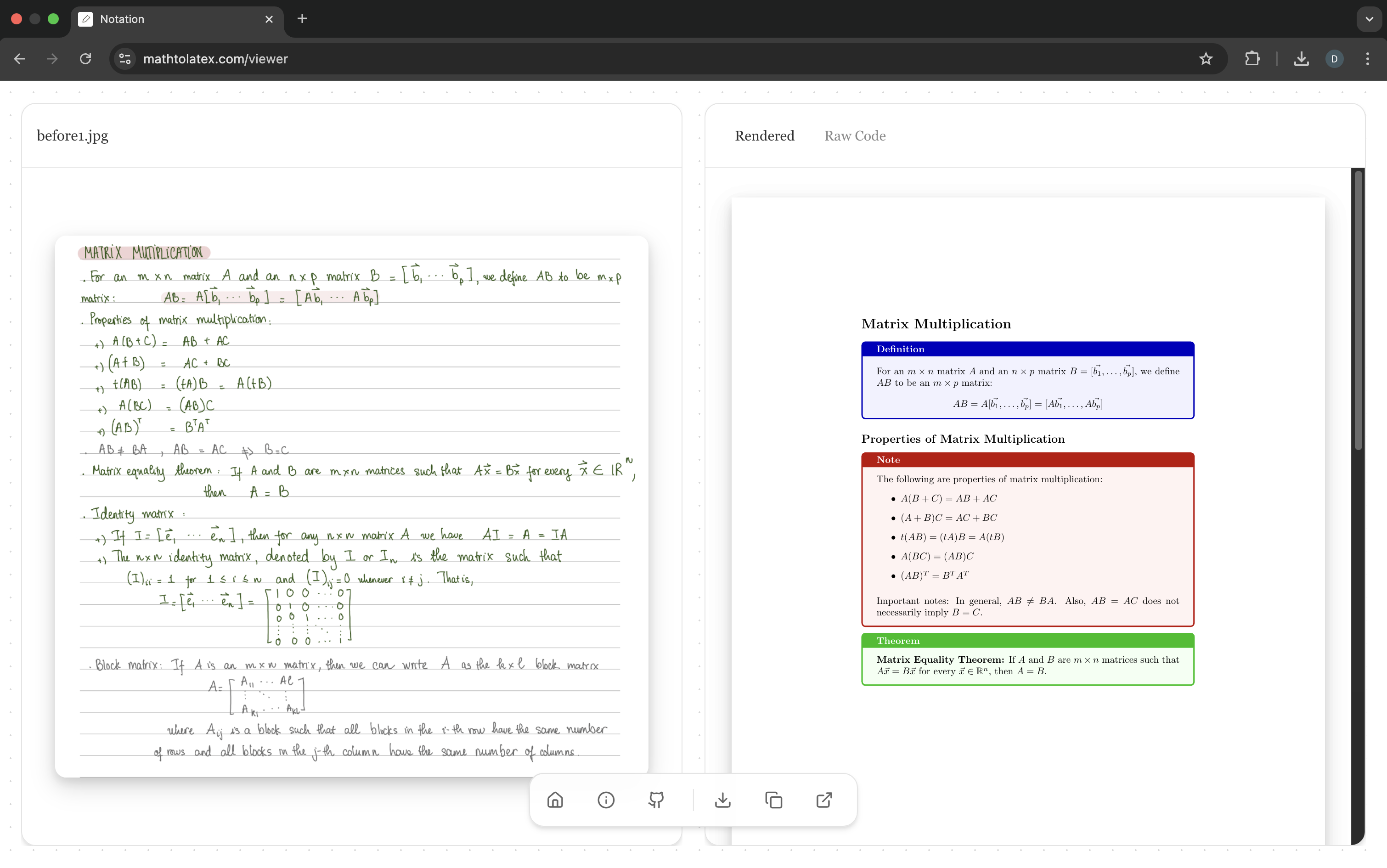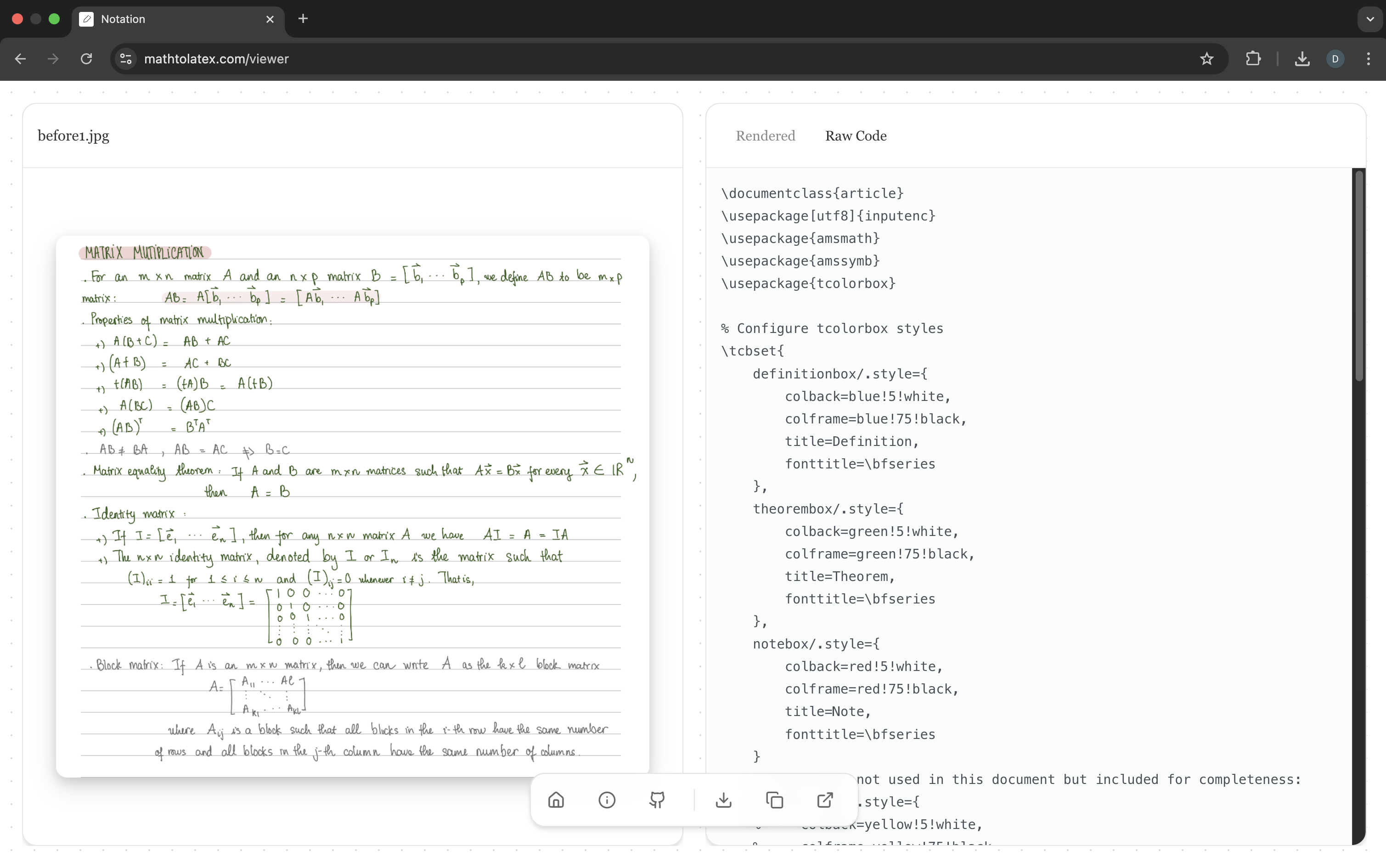 We built Notation to help users convert scanned documents and images into editable LaTeX. Whether it's mathematical equations, technical papers, or complex formulas, Notation uses AI to intelligently extract content and format it as clean, compilable LaTeX code.